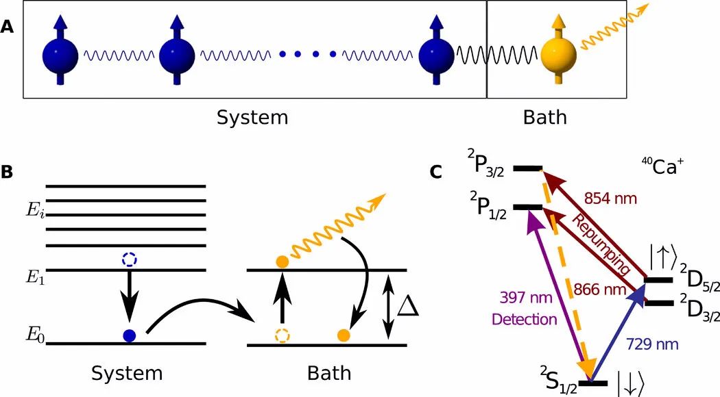 (上图所示)量子模拟器的交感冷却:(A)执行量子模拟的N个自旋系统正在与另一个被耗散驱动的浴场自旋相互作用;(B)显示系统与槽之间共振能量传输的能级结构示意图,之后槽自旋被耗散泵入其基态;(C)利用俘获的40Ca+离子实现的能级方案。图片:Science Advances
