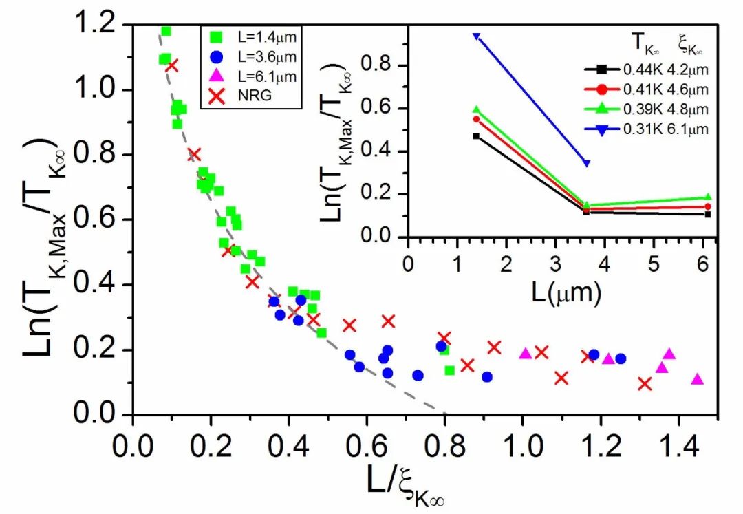 当电导出现振荡时,测得的近藤温度也出现振荡。当研究人员绘制近藤温度的振荡幅度与离杂质势垒距离除以理论云层长度时发现,正如理论上预期的那样,所有数据点都落在一条曲线上。研究已经从实验上证实了近藤云微米尺度的原始理论结果,首次通过直接测量近藤云层长度证明了云层的存在,研究还找出了连接近藤云层大小和近藤温度的比例因子。