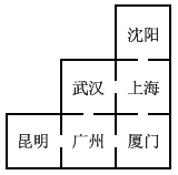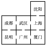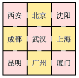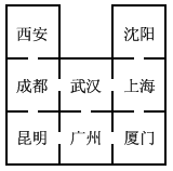 魔术师对一个观众说,我们来玩一个游戏。假设你是一个旅行者,下面有一张地图,上面九个格子,分别代表西安、北京、沈阳、成都、武汉、上海、昆明、广州、厦门九座城市。