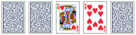 然后魔术师的助手说:“其实我并不是真正的魔术师,下面请大师登场。”魔术师上场后,助手继续说:“首先,我抛砖引玉,随便翻开两张牌。比如第三张——是张 K;再翻开第四张——一张 10。剩下三张背面朝上的牌都是什么,就要看魔术大师的功力了。”