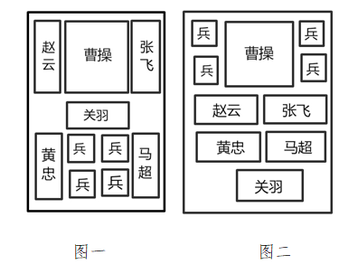 华容道有几十种布阵方法,如“横刀立马(图1)”“近在咫尺”“过五关(图2)”“水泄不通”“小燕出巢”等。华容道的诸多排列方法,可以由此衍生形成非常复杂的棋局。