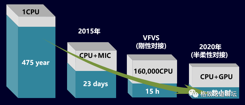 在2015年的时候,在“天河2”上采用CPU和加速器协同的工作方式后,可以把这个计算缩短到23天。