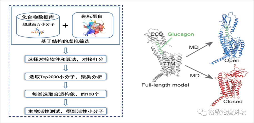 从这里面选择分高的化合物结构进行聚类分析,再分析它的构象,然后选取大概100个交给实验科学家做一些分析,最后经历后续的漫长实验,得到一些有活性的小分子。