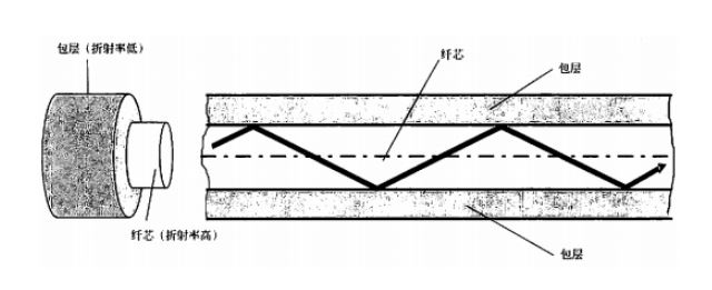 光纤是利用光在疏密不同的介质里传导发生全反射的原理制作而成,光纤的结构包括3部分,从内到外分别是纤芯、包层和覆层,核心部分是纤芯和包层,它们都是由高纯度的石英制成,其中包层部分掺有微量的氟元素使其折射率变低,包层裹着的纤芯则掺有锗等元素,让其折射率较高。这样以一定的角度射入光,就会在光纤内部发生全反射,不管光纤如何弯曲,光都会像流水一样在光纤内部前行。