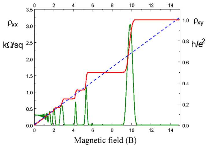 霍尔效应很快就在测量载流子浓度、测量磁场强度、磁流体发电甚至汽车点火上得到了应用。谁也没有想到,霍尔效应发现100年后,由于半导体技术的发展,人们已经实现了将电子束缚在一个近乎二维的平面上,实现了“二维电子气”。1980年,德国科学家冯·克利青(Klaus von Klitzing,1943-)发现:在1.5K度(摄氏-271度)和19.8T的极强磁场下,二维电子气也会产生一个类似霍尔效应的现象,但是奇怪的是测量到的霍尔电压并不是连续的,只能取一些间断的数值,就像一个个台阶一样,霍尔电压和电阻的关系可以表示成某个整数和普朗克常数的关系式。由于出现了普朗克常数,因此这是一个量子效应,被称为整数量子霍尔效应,他因此获得1985年诺贝尔物理奖。