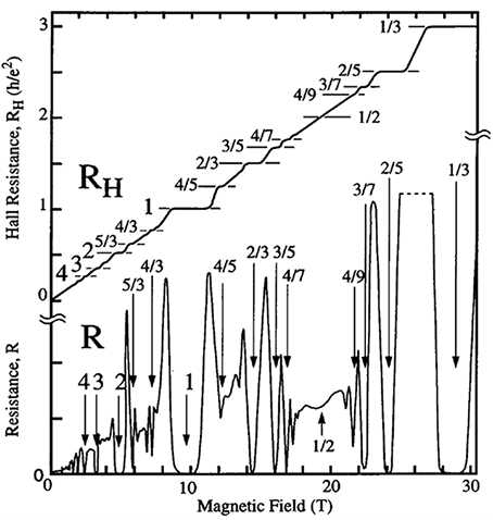 1982年,已经是普林斯顿大学电子工程系教授的崔琦在整数量子霍尔效应的实验基础上,推测在二维电子气更薄、温度更低和磁场更强的条件下,也许还会有意想不到的奇迹发生。功夫不负有心人,崔琦和他的同事Horst Stormer用砷化镓等半导体材料代替了传统的二氧化硅,在85mK的低温和280kG的磁场下,量子霍尔效应方程的n居然可以取分数值!也就是说在克利青发现的“台阶”之间还有一些“小台阶”,这是一种全新的物质形态,他们命名为“分数量子霍尔效应”,最终获得了1998年诺贝尔物理奖。