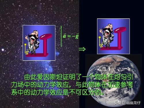 当实验者准备乘电梯从摩天大楼顶层至底楼时,他进入全封闭的厢式电梯。突然,电梯线缆断裂,电梯加速坠向地面。实验者在电梯里就会有失重的感觉。那如果我们把这截全封闭的电梯带到太空,里面的实验者同样也会有失重的感觉。但是在全封闭的电梯里,实验者是无法分辨到底是因为加速度还是引力的原因造成自己失重的。