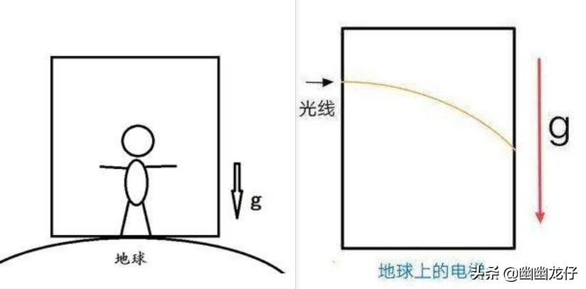 由于引力和加速度是等效的,电梯静止放置在地面上,光线也会因为受到地球的引力而向下偏折——引力的本质就是时空的弯曲!