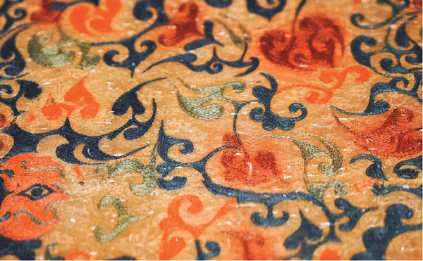 这些丝织品颜色丰富,有茶褐、绛红、灰、朱、黄棕、棕、浅黄、青、绿、白等数十种色彩,如此斑斓的色彩是汉代染色技巧高超的有力印证,而以红、棕为主要色调的服装又很好地印证了楚地崇拜凤鸟和火神的信仰习俗。花纹的制作技术又分织、绣、绘等不同工艺,且这些纹样又有各种动物、云纹、卷草、变形云纹以及菱形几何纹等,可谓工艺复杂,纹样多彩。汉代学童的启蒙读物《急就篇》中有“豹首落莫兔双鹤,春草鸡翘凫翁濯”的诗句,就是通过花纹与识字结合,用潜移默化的方式将文化传承、渗透到儿童教育中。