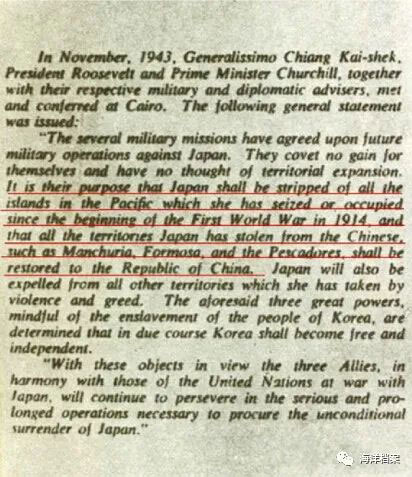 1943年12月1日,中、美、英三国发表了《开罗宣言》,坚持日本无条件投降,剥夺日本自1914年“一战”后在太平洋所占领之一切岛屿;规定“日本所窃取于中国之领土,例如东北四省、台湾、澎湖群岛等,归还中华民国。其他日本以武力或贪欲所攫取之土地,亦务将日本驱逐出境”。