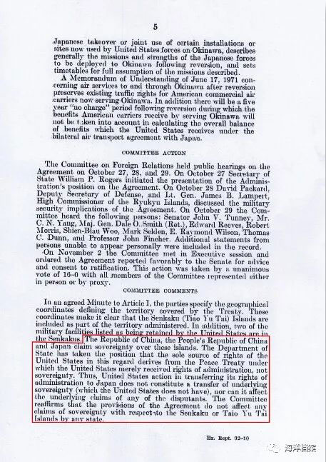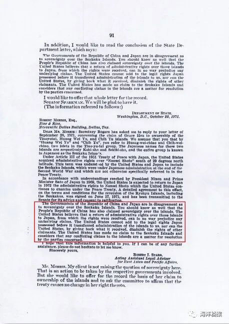 1971年11月,美国参议院批准《关于琉球诸岛及大东诸岛的协定》时,美国国务院发表声明称,“中华民国、中华人民共和国及日本,都宣称对这些岛屿拥有主权。美国国务院认为美国在这方面的权利完全来自对日和约,从这和约美国只接到管理权,没有主权。所以当美国把管理权交给日本时,并不表示主权的转移(美国没有主权),也不影响任一方主权的主张。本委员会重申这个条约不影响任何一方对尖阁诸岛或钓鱼岛列屿主权的主张”。这一声明表明,美国并未承认日本对钓鱼岛拥有主权。