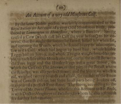 一个贵族跟皇家学会讲了件事,在英格兰汉普郡的一个名叫利明通的城镇,一个屠夫宰了一头刚长肥的母牛,然后打开了它的子宫,看到了令他震惊的一幕: