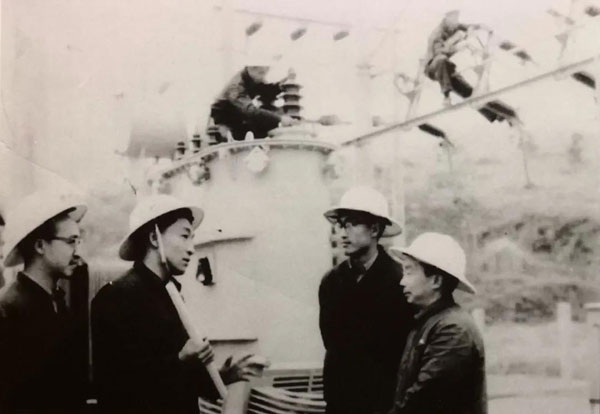 1968年,汤忠德(左二)在电力建设现场。
