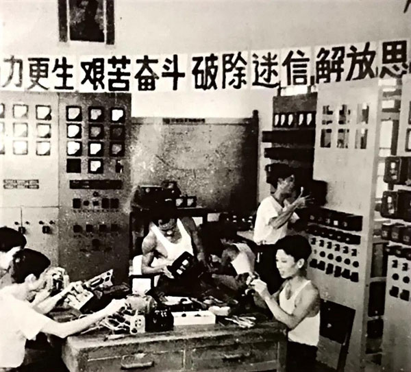 1954年,电力工人在阳明路变电站完成电容器的安装及调试工作。