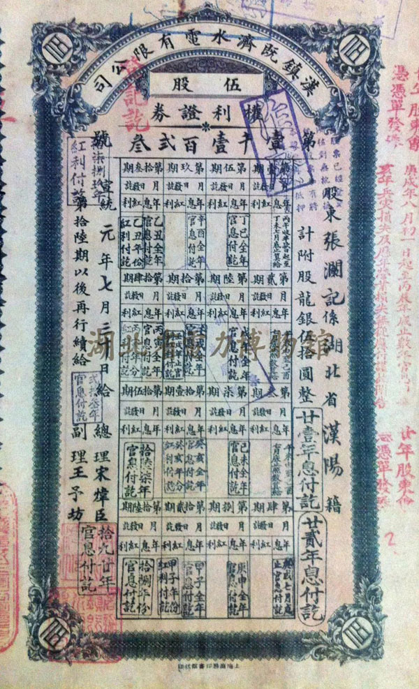 湖北电力博物馆收藏着目前国内发现最早的一张电力股票权利证券——1909年汉镇既济公司伍股股票权利证券。