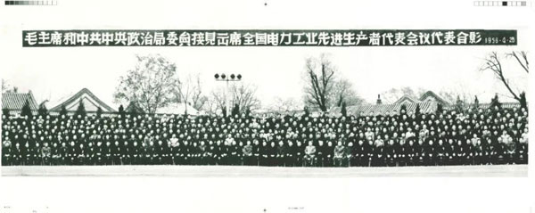 1956年,毛主席和中共中央政治局委员接见全国电力工业先进生产者代表,并与他们合影。黑龙江牡丹江供电公司前身牡丹江电业局职工王福琨(二排右四)就在其中。他1948年参加工作,先后担任镜泊湖发电厂电气分场值班员、牡丹江电业局变电工区值班长,凭借高超的电气运行技术及高度的工作责任心,为工农业生产发展做出贡献。1956年,他被水电部授予劳动模范光荣称号,参加了全国水电系统劳动模范表彰大会。
