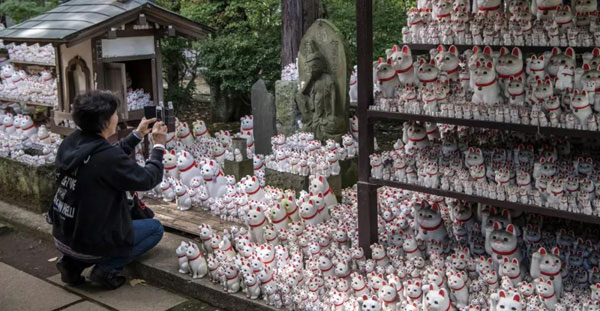 一位游客正在拍摄装饰在豪德寺前的众多招财猫塑像,该寺正是这种幸运塑像的诞生地。© CARL COURT/GETTY IMAGES
