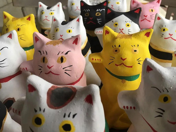 在爱知县的常滑市,甚至还有一条招财猫街(招き猫通り),街道上装饰着几十个陶瓷猫塑像。在东京,你可以直接去到处都是招财猫的豪德寺,或是去参观今户神社,那里也出售它们自家风格的招财猫。