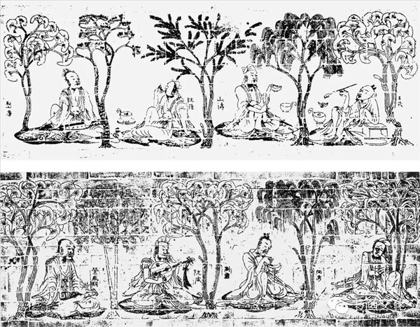 《竹林七贤与荣启期》模印砖画到了魏晋南北朝时期,由于当时的社会风气,墓葬中的壁画大多是人们宴乐时的情景。相比起汉代人民对于仙界生活的想象,此时的人们更乐意展现自己的精神境界和生活情景。其中,魏晋墓室中最著名的,应该就是类似彩绘壁画砖构筑起来的砖墓壁画,每块砖上有一个独立的画面,也可以将内容有联系的多块砖组合起来,表达一定的主题。