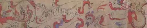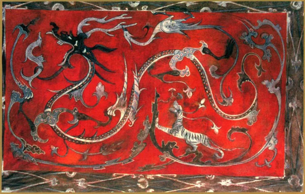 升天图(局部),九原岗墓出土以汉代时期的墓葬来看,这个时期的壁画呈现出一种完善的生死观念。墓室顶部早先画升仙的图像,后来则是画日月星辰、云气,代表四方神的青龙、白虎、朱雀、玄武,以此象征天界。