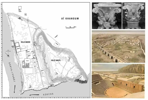 左为阿富汗北部阿伊--哈努姆遗址的平面图,右边自上至下依次是遗址中发现的科林斯式柱头、城市遗址俯瞰、圆型大剧场复原图,这座城市是希腊化时代阿富汗北部诸多城市之一,足可见当时阿富汗的繁荣。来源/网络