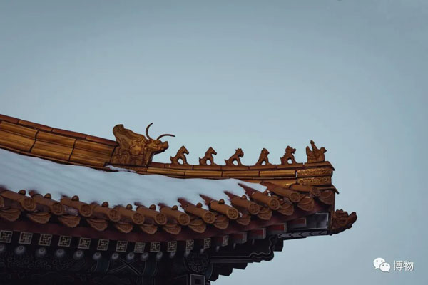 官式建筑殿宇屋顶上的正脊和垂脊上,各有不同形状和名称的吻兽,以其形状大小和数目多少,来代表殿宇等级的高低。我们经常能在古城楼的房脊飞檐上看到个大龙头啥的,那都属于吻兽。
