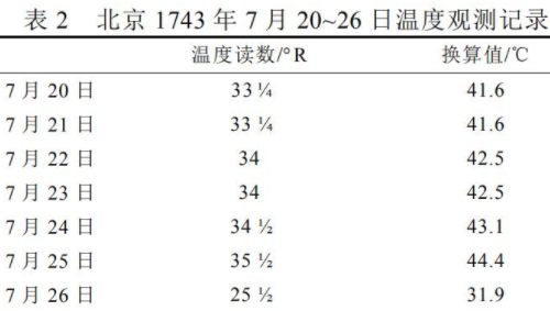 在《中国三千年气象记录总集(卷三)》中也有所记录:1743年清朝乾隆时期,7月下旬华北地区下午均温高于40摄氏度,峰值最高时达44.4摄氏度。