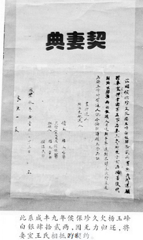 妾在家庭之中,与丈夫有夫妻之实却无夫妻之名。《喻世明言》中讲了这样一个故事:一个小官贾涉,携一仆人到杭州钱塘,途经王小四门口,想停下歇脚,就在门外喊道:“屋里有人吗?”这一喊出来个妇人(王小四之妻),虽荆钗布裙,却一副妖娆模样,长得是“随他呆子也消魂,况是客边情易动。”贾涉看得发呆,欲买之为妾,王小四一口应承,讲明身价40两银子。贾涉大喜,马上请来村里的教书先生,写了卖妻文契,双方在上面落了字画了押,王小四就把老婆卖给了贾涉。