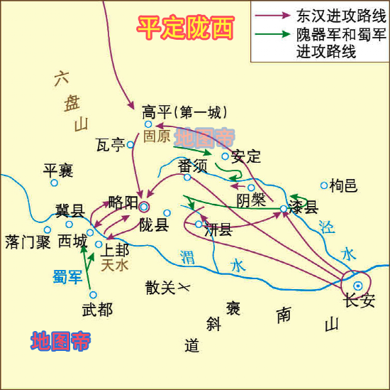 扫平关东地区以后,刘秀派大将耿弇等人从陇西攻蜀,隗嚣派兵阻止,双方爆发持续数年的大战。公元33年,隗嚣病死后其子隗纯继位,不久投降,至此陇西被东汉平定。