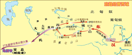 公元73年派班超出西域,反击匈奴。班超经营西域二十余年,使得西域摆脱匈奴的控制,西域诸王重新归汉,东汉重设西域都护府,将西域纳于汉王朝统辖之下。班超还派甘英出使大秦(罗马帝国),虽未能抵达,但也加深了对中亚地区的了解。