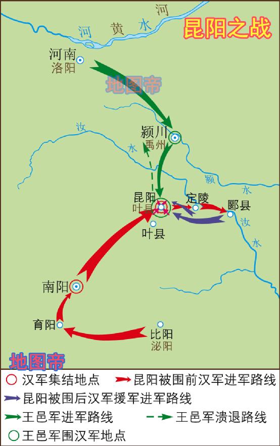 在推翻王莽新朝的过程中,绿林军是主力军,公元23年,绿林军拥刘玄为帝,恢复汉朝国号。王莽派王寻、王邑率大军四十多万进攻绿林军驻守的昆阳(今河南叶县),昆阳之战爆发。刘秀率十三骑突出重围调集援军,绿林军内外夹击,以少胜多大败新军。昆阳之战是刘秀成名之战,为其日后称帝打下坚实的基础。