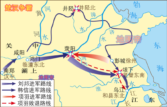 交战的楚汉双方在荥阳一线战况胶着、僵持不下,刘邦派韩信渡过黄河,由山西北上,侧面迂回,攻占赵、齐等地后,合围项羽。