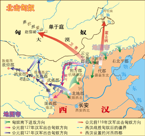 公元前127年,汉武帝派卫青北击匈奴,收复河套地区。公元前121年,汉武帝派霍去病再次进攻匈奴。霍去病长途奔袭千里,大破匈奴,收复河西走廊,设武威、张掖、酒泉、敦煌河西四郡。公元前119年,卫青、霍去病兵分两路奔袭漠北,深入敌境数千公里,重创匈奴,使得匈奴不敢南下。