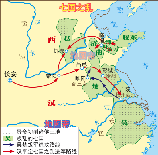 西汉初至汉景帝时,轻徭薄赋,休养生息,社会得以稳定发展,史称文景之治。诸侯王势力也逐渐强大起来,对王朝统治造成威胁。汉景帝时,打算削弱诸侯王的势力,引起吴王刘濞等七国发动叛乱,史称七国之乱,但是不到3个月就被朝廷平定。