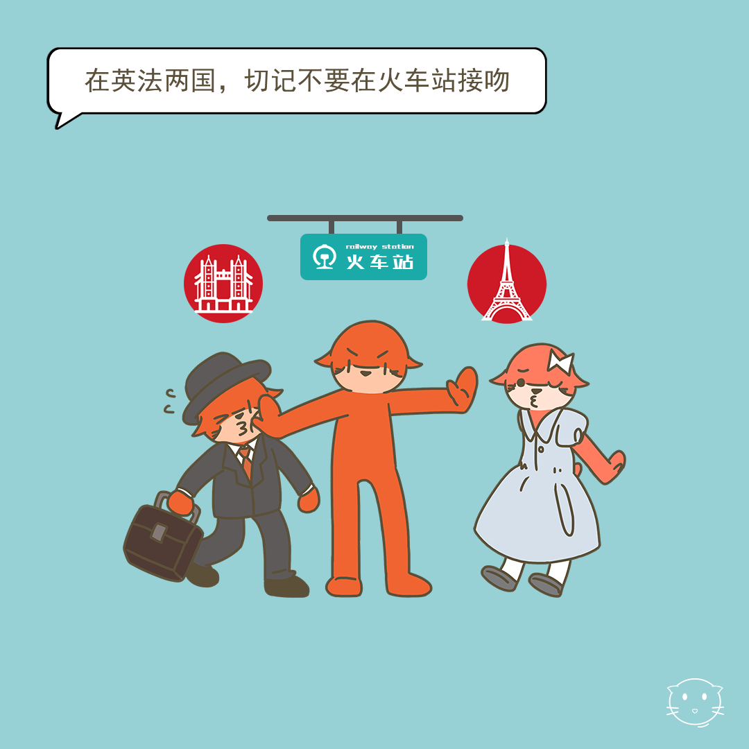 遇到彼此不太了解对方时,在这几个国家也能通过握手表示友好。 但如果你在英国或者法国,记得不要在火车站行亲吻礼! 从1910年4月5日起,法国人失去了在火车站亲吻送别的机会。英国维京火车公司也在英格兰西北部的沃灵顿河岸码头火车站贴出了“禁止接吻”的标示图。 法国和英国是有法律规定不能在火车站接吻的哦!