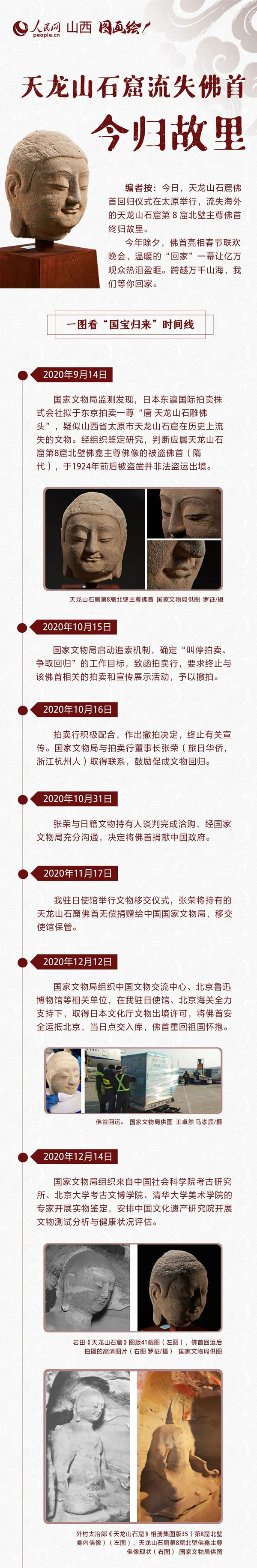 该佛首源自天龙山第8窟北壁佛龛内佛像,应为1924年前后被盗。2020年12月,佛首平安回归,是近百年来第一件从日本回到祖国的天龙山石窟流失佛雕。