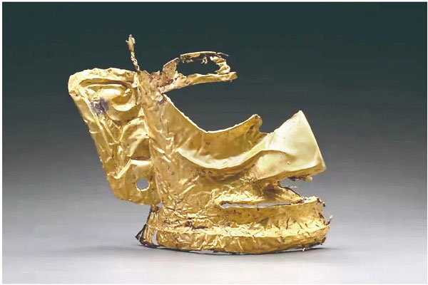 方形面部、镂空大眼、三角鼻梁,还有宽大的耳朵——面具风格与此前三星堆出土的黄金面罩和金沙大金面具风格十分相似。虽只有半张,但比完整的金沙大金面具还要大,宽度约23厘米,高度约28厘米,而且颇有厚度,不需要任何支撑,就可以独自立起来。