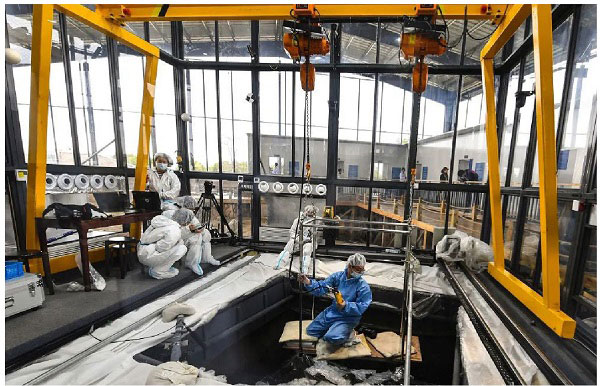 为什么?发掘现场,一个大跨度钢结构大棚里,数个通透的玻璃房子将6个“祭祀坑”罩住。在控温控湿、装满各类设备的“考古舱”里,工作人员身着防护服进行工作。不仅如此,考古实验室也“前移”到考古现场,必要的先进设备一应俱全,实现考古出土文物与文物保护与研究的无缝对接。
