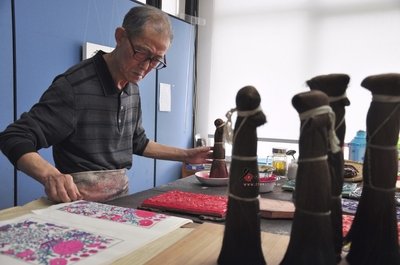 然后牵纸上版,再用擦子擦印。牵纸也是一门手上功夫,牵纸要松紧统一,不上不下,不左不右,每一手料始终保持一个位置,这样才能够保证套色的准确性。接着,再来学习一下擦子功夫。
